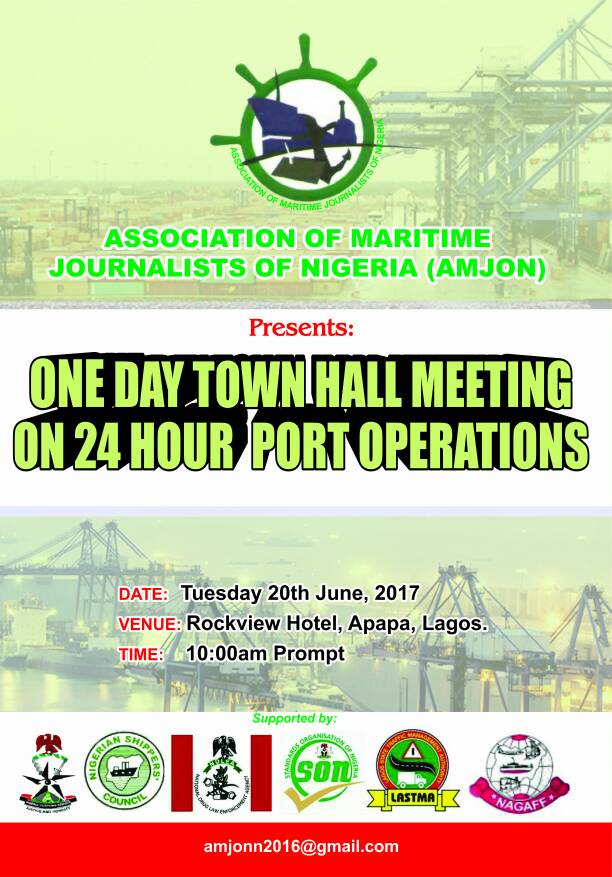 The meeting being convened by Association of Maritime Journalists of Nigeria (AMJON) will come out with possible suggestions after encapsulating various views on the 24hour port operation regime from maritime stakeholders. The meeting holds at Rockview Hotel Apapa on Tuesday, June 20, 2017, at 10am.
