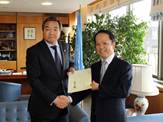 Mr. Noriyoshi Yamagami, Minister, Alternate Permanent Representative of Japan to IMO (pictured, right, with IMO Sec-Gen Sekimizu), and Mr. Yasu Onishi, Alternate Permanent Representative of Japan to IMO, deposited Japan’s instrument of accession to the International Convention for the Control and Management of Ships’ Ballast Water and Sediments, 2004.