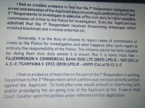 “I find no credible evidence to find that the 1st Respondent instigated the arrest and detention of the Applicant (Edet Okpo) beyond sending his petition to the 2nd and 3rd Respondents to investigate in exercise of his civic duties to report possible commission of crime to the police for investigation. Even the applicant has admitted that the 1st Respondent received threatening messages which entailed blackmail and criminal extortion etc.