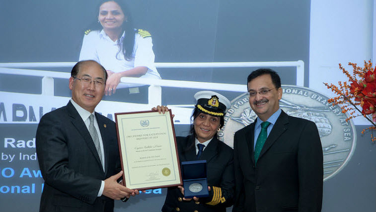 speaking after IMO Secretary-General Kitack Lim presented her with the 2016 IMO Award for Exceptional Bravery at Sea on Monday during an emotional ceremony, Captain Menon becomes the first female captain in the Indian Merchant Navy and the first female to receive the IMO Award for Exceptional Bravery at Sea.