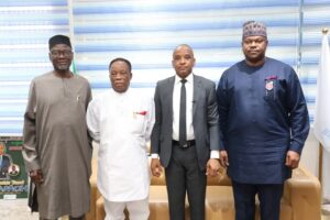 L-R: Executive Director, Maritime Labour and Cabotage Services, Nigerian Maritime Administration and Safety Agency, NIMASA, Engr. Victor Ochei; Director General NIMASA, Dr. Bashir Jamoh OFR; Chairman, Cabotage Vessel Financing Fund (CVFF) Committee of the Nigerian Indigenous Shipowners Association (NISA), Dr. Edward Sohwo and Executive Director Operations NIMASA, Mr Shehu Ahmed during a visit by the NISA CVFF Steering Committee to the NIMASA headquarters.