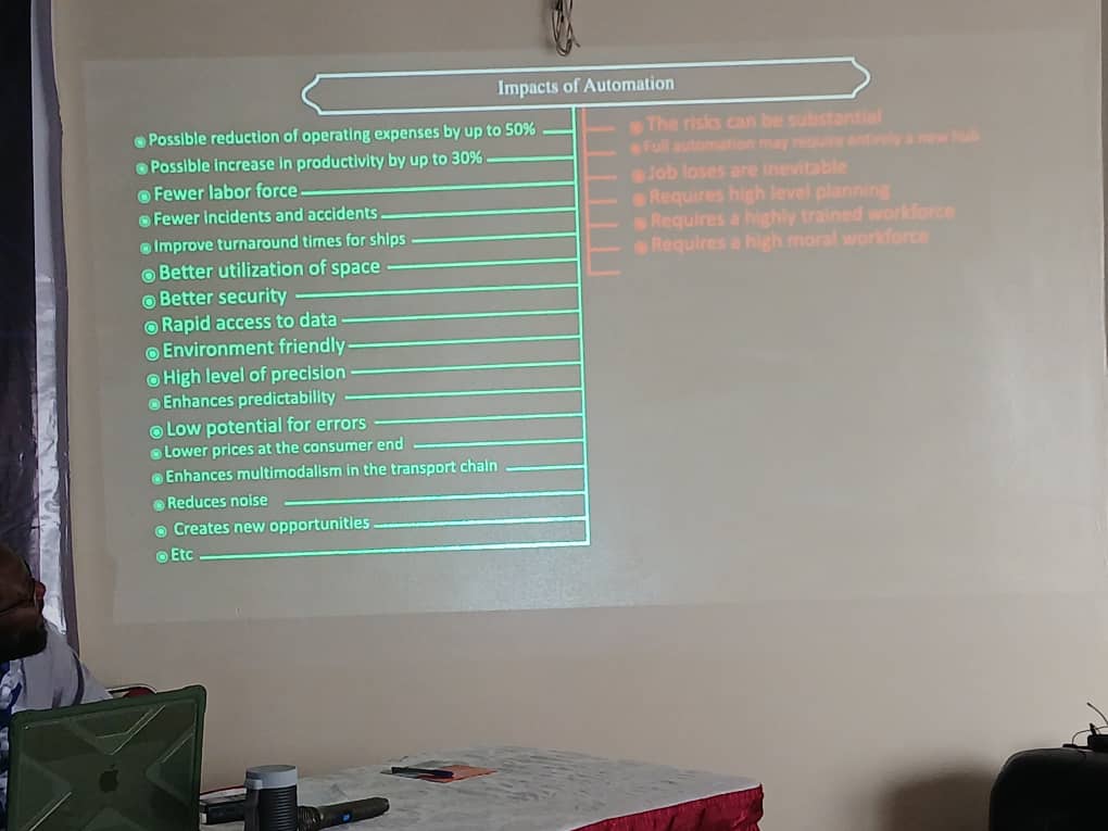 With visuals and slides, Captain Enisuoh demonstrated the impacts of automation with clear evidence of reduction in operating costs of up to 50%, better utilization of spaces, reduced human interference, increased productivity, improved access to data, enhanced security, improved turnaround time for ships, enhanced multi-modalism, noise reduction, and endless opportunities and growth for country and citizens.