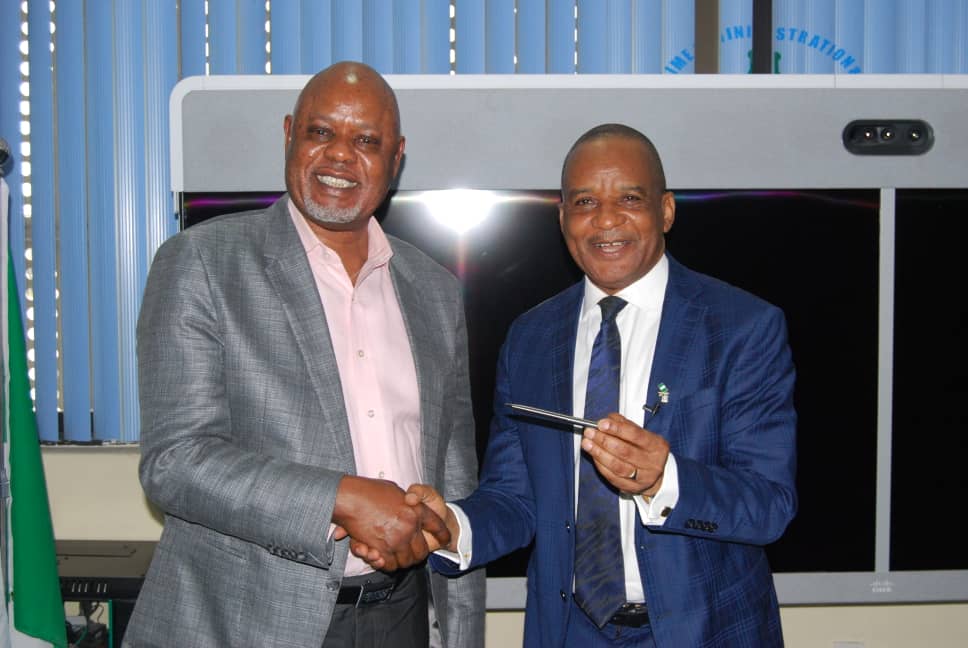 L/R: Managing Director, Starz Marine and Engineering LTD., Engr. Greg Ogbeifun and Director General, Nigerian Maritime Administration and Safety Agency (NIMASA), Dr. Bashir Jamoh during the visit by the Greg Ogbeifun Institute of Maritime Technology and their partners APEC/OCHA from the Port of Antwerp Belgium to NIMASA Headquarters in Lagos.