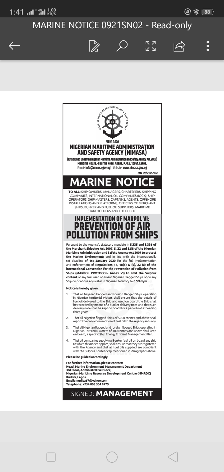 NIMASA ISSUES MARINE NOTICE Last updated Sep 7, 2021 0 Share 0 Share FacebookTwitterGoogle+WhatsAppPinterestEmail