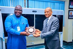 DG NIMASA Dr. Bashir Jamoh (right), presenting a souvenir to Managing Director, Dangote Port Operations, Akin Omole during the courtesy visit