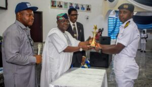 Mesaiyete Taofiq Omotayo, the Best  Graduating Cadet, receiving his prize from the Chairman Governing Board, MAN, Rear Admiral Jacob Ajani (rtd)