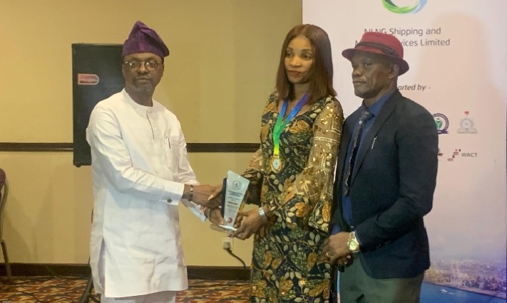 Moses Abere, presents a plaque to image maker of the Maritime Academy of Nigeria, Domo Umoekpe at the AMJON 2025 Conference.